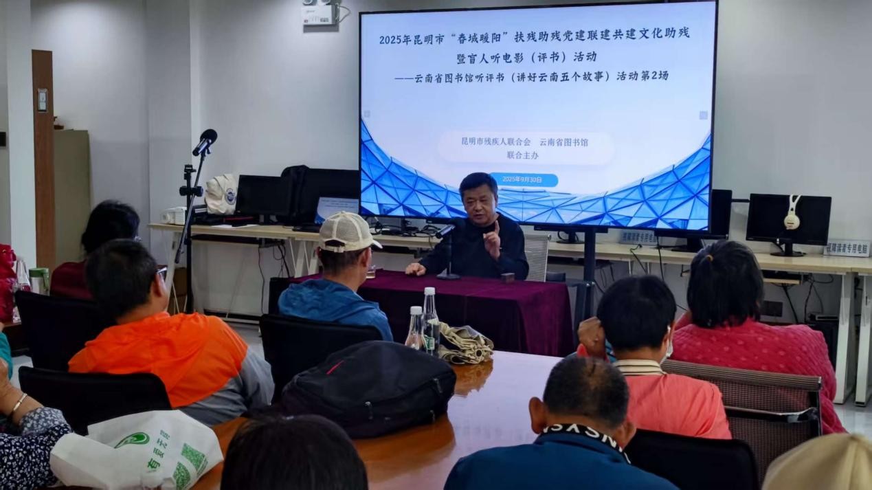 中秋国庆双节临近,为丰富视障群体精神文化生活,传承红色基因与中华优秀传统文化,9月30日下午,昆明市残疾人联合会与云南省图书馆联合举办的2025年昆明市“春城暖阳”文化助残暨“盲人听电影(评书)”系列活动第二场评书专场活动在云南省图书馆视障阅览室暖心启幕,50位视障朋友及陪护人员共享了一场兼具文化温度与节日氛围的视听盛宴。
