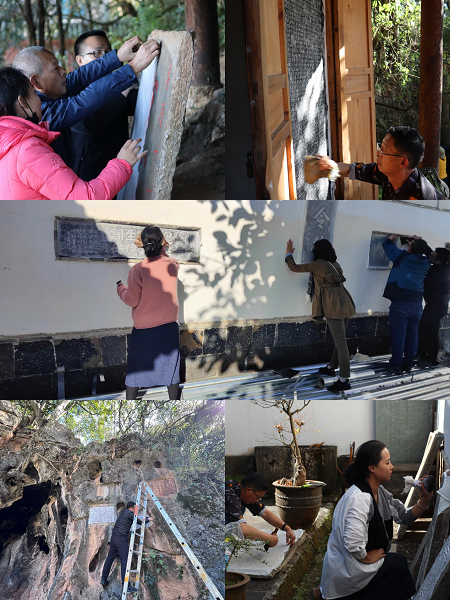 培训班野外传拓由云南省古籍保护中心主任马云川带领省中心4人并遴选传拓骨干学员3人共同实施,对施甸县清平洞邓子龙将军遗迹、腾冲李根源旧居、和顺图书馆馆藏碑刻进行保护拓印。其中万历十五年的《恤忠祠记》碑高2.05米,宽0.9米,记述明将邓子龙平定内乱、击败外国入侵者、维护国家领土完整的功勋,缅怀以身殉国的忠勇将士。因时代久远,碑文有些字迹已不甚清晰,拓印更显重要。