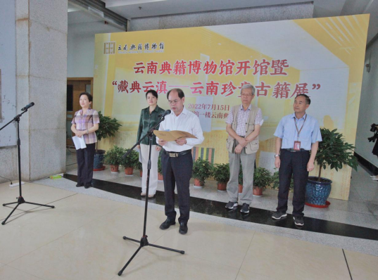 国家图书馆馆长、国家古籍保护中心主任、国家典籍博物馆馆长熊远明首先致辞,他表示,成立典籍博物馆,将图书馆的馆藏典籍优势与博物馆的展览展示特长相结合,将蕴含着中华民族历史记忆、思想智慧、知识体系的典籍进行挖掘、展示和研究,不仅契合了当今世界上图书馆、博物馆、档案馆等文化机构发展融合的趋势,也是弘扬中华优秀传统文化、革命文化,繁荣社会主义文化的重要举措。近年来,在“中华古籍保护计划”的支持下,云南在汉文古籍以及少数民族古籍普查、保护、修复等方面取得丰硕的成果,培养了一批古籍修复尤其是少数民族古籍修复人才。这些都是云南建立典籍博物馆的重要基础。云南成立典籍博物馆不仅是云南图书馆界的一件大事,也是我国文化领域的一次盛事。云南典籍博物馆的成立,使云南典籍文化和云南地方特色的宣传展示多了一个重要窗口,云南收藏的各时期善本、地方文献、少数民族文字古籍、名家手稿、字画、金石拓片等典籍载体,通过实物展示、图文、多媒体、典籍衍生社会教育活动等多种形式,勾勒云南的历史发展和文明进程,展现云南在保护、弘扬中华优秀传统文化,增进民族团结和边疆稳定等方面做出的贡献,增强云南地区各族群众对民族文化的自信和对国家的认同。今后,国家典籍博物馆将与云南典籍博物馆以及国内其他典籍博物馆携手共进,充分发挥各馆的典藏优势,不断推进全国各个典籍博物馆之间的交流和互助,实现典籍资源的整合和共建共享。