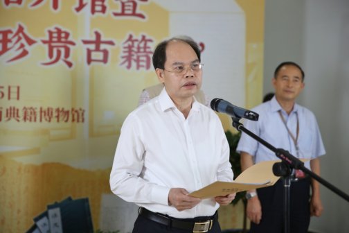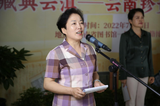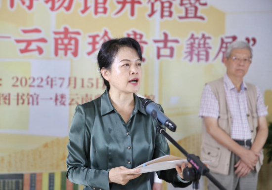 云南省文化和旅游厅党组成员、副厅长王江红致辞,向全体参加仪式人员介绍了“中华古籍保护计划”实施以来云南古籍保护工作开展情况和所取得的各项成绩。她指出,云南典籍博物馆的成立,是云南省古籍保护十五年工作成果的集中体现,是拓展图书馆服务的探索和创新,为社会搭建了展示中华优秀传统典籍文化的平台,有利于进一步拓宽优秀传统文化传播途径,增进广大群众对中华文化的认同感和自豪感。今后要进一步加强古籍抢救保护、整理研究和出版利用,保护好、研究好、利用好中华优秀典籍,促进古籍事业发展,进一步坚定文化自信,以更好的精神风貌迎接党的二十大胜利召开。