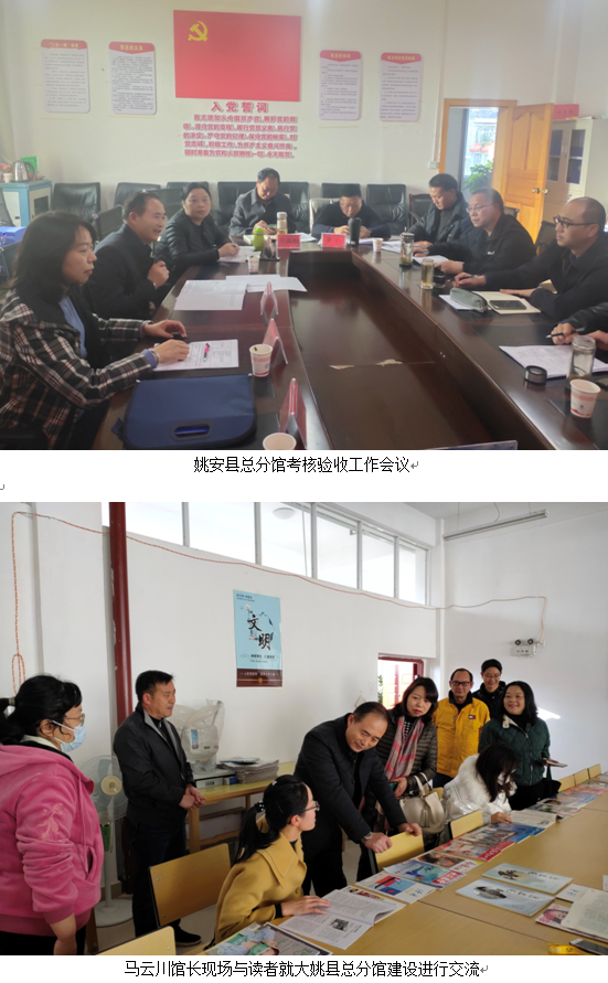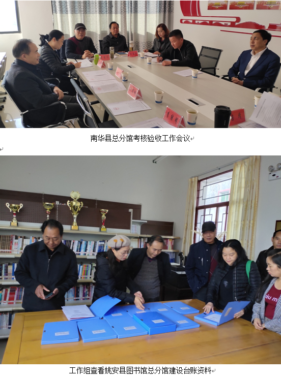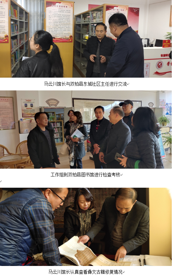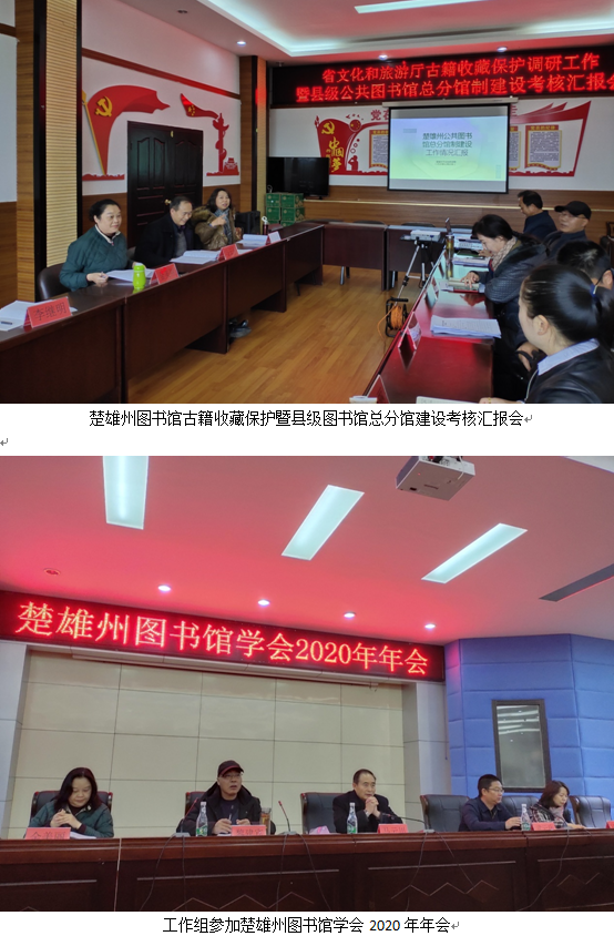 按照《云南省文化和旅游厅关于组织开展县级文化馆图书馆总分馆制建设验收和总结工作的通知》《云南省县级图书馆总分馆制建设考核验收实施方案》,由云南省图书馆馆长马云川带队的第一考核验收组于2020年12月16日至21日赴楚雄州开展了县级图书馆总分馆制建设考核验收,同时就古籍收藏保护进行了实地调研。