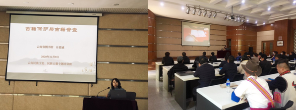 12月9日,云南省民族宗教委和云南民族干部学院联合举办的“提升民族民间传统文化突出人才综合素质,推进全面脱贫与乡村振兴有效衔接——云南民族文化、民族古籍专题培训班”的80余名学员到云南省图书馆学习交流民族古籍保护工作。