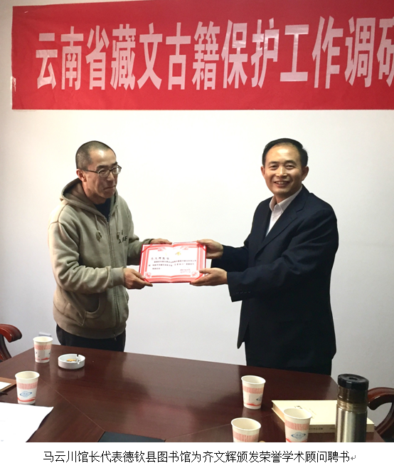 5月22日,调研组深入迪庆州德钦县实地参观了奔子兰镇文化站、云上乡愁书院农家书屋,奔子兰锅庄传习中心。在德钦县图书馆,调研组召开调研座谈会,德钦县文化和旅游局、文联、文物管理所、文化馆、博物馆等单位负责人及古籍普查志愿者参加。会上,调研组听取了德钦县藏文古籍保护、总分馆建设、数字图书馆等工作情况汇报,重点听取了德钦县图书馆关于700多册西文古籍的保护工作情况。据悉,德钦县图书馆为了整理这些原收藏于德钦县茨中教堂的西文古籍,特别邀请毕业和旅居于法国的齐文辉博士作为此项工作的志愿者。齐博士在此次会议上,专门从这批西文古籍的数量、类别、内容、语言、年代进行了说明,并就其人文价值、史料价值和文物价值提出了自己的观点,为做好下一步保护工作提供了重要的思路。会上,马云川馆长为齐博士颁发了荣誉学术顾问的聘书。会后,调研组还实地参观了珍贵的西文古籍特藏,并就如何开展修复、保护、编目、整理和研究进行了深入讨论。