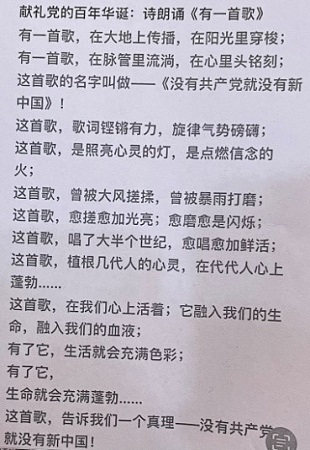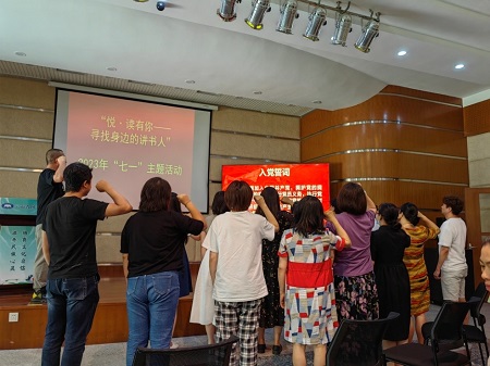 最后,读者代表共同诵读由热心讲书人自行创作的诗歌《有一首歌》,整个活动达到高潮,这首诗歌表达出全体人民对党的感谢,对党的忠诚,对党的热爱。