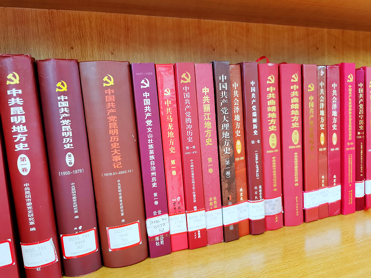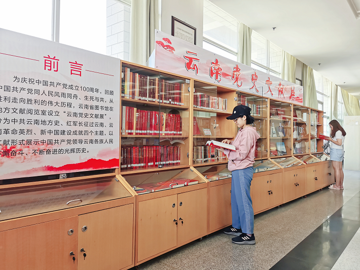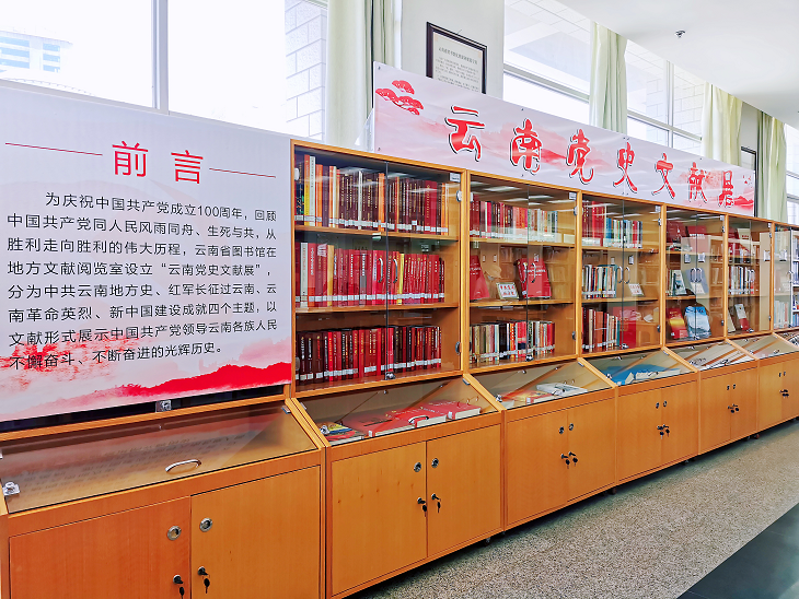 为庆祝中国共产党成立100周年,扎实开展党史学习教育,回顾中国共产党同云南人民风雨同舟、生死与共,从胜利走向胜利的伟大历程,云南省图书馆在地方文献阅览室设立“云南党史文献展”,分为中共云南地方史、红军长征过云南、云南革命英烈、新中国建设成就四个主题,以文献形式展示中国共产党领导云南各族人民不懈奋斗、不断奋进的光辉历史。