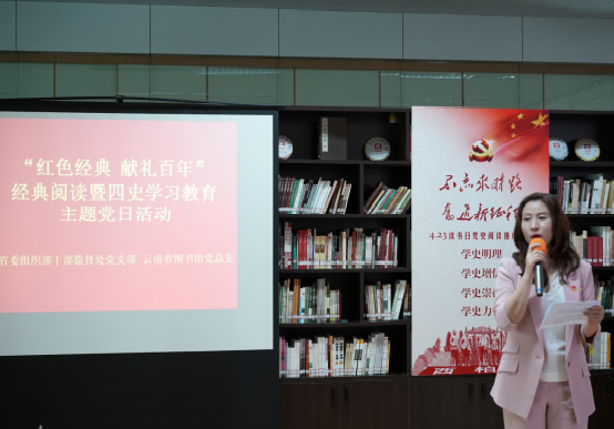 为扎实开展党史学习教育暨四史宣传教育,热烈庆祝中国共产党成立100周年,推动党史学习教育在党员干部中走深走实、深入人心,2021年7月30日,云南省图书馆党总支与云南省委组织部干部监督处党支部联合开展了“红色经典•献礼百年”经典阅读暨四史学习教育主题党日活动。省委组织部干部监督处副处长、党支部委员谭启及相关党员,云南省图书馆党总支副书记、副馆长鲁颖及各支部党员代表共10余人参加活动。