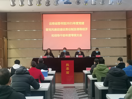 12月31日,云南省图书馆2021年度党建暨党风廉政建设责任制及领导班子和领导干部年度考核大会召开。由云南省文化和旅游厅党组成员、副厅长、省文物局局长杨德聪带队的第二考核组全体成员,省图书馆领导班子成员,各支部书记、委员,全馆中层干部,专业技术人员代表,民主党派人士,群众代表参加会议。云南省图书馆党总支副书记、副馆长鲁颖主持会议。