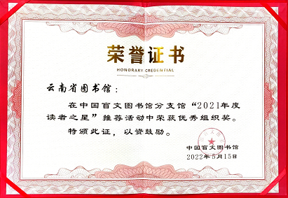 云南省图书馆荣获“2021年度读者之星”活动优秀组织奖