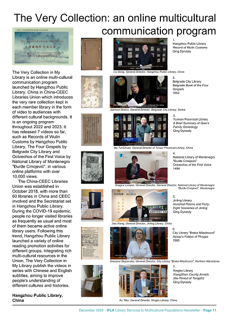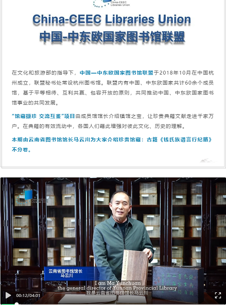 2022年,在文化和旅游部的指导下,云南省图书馆参与了中国-中东欧国家图书馆联盟“馆藏撷珍 交流互鉴”项目实施。该项目由作为中国-中东欧国家图书馆联盟秘书处的杭州图书馆策划发起,通过线上短视频与文字相结合的方式,由不同国家的图书馆馆长为多元文化群体推荐各自馆藏珍贵古籍,让书写在古籍里的文字活起来、走进千家万户,借此增强各国人民对彼此文化、历史的理解。