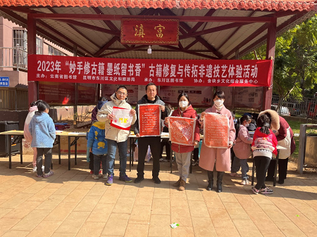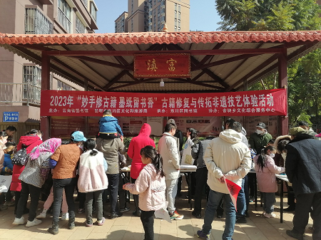 为喜迎一年一度的新春佳节,丰富群众的节日文化生活,让广大基层群众沉浸式体验中华优秀传统文化魅力,增强群众对中华民族文化的自豪感和认同感,更好地传承弘扬中华民族文化,2023年1月17日,云南省图书馆与东川区文化和旅游局联合开展了“妙手修古籍,墨纸留书香”——古籍修复与传拓技艺观摩体验活动。活动在东川区舍块乡易地搬迁安置点龙润社区隆康园举行。近500名社区群众参加活动。