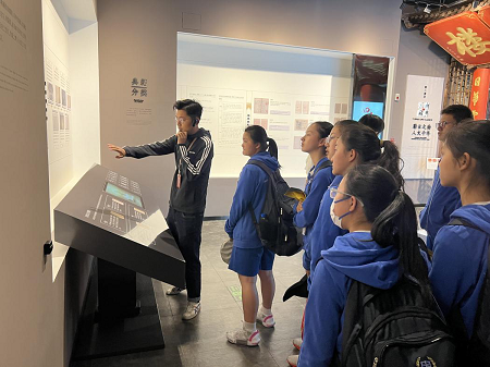 图为讲解员向学生们介绍云南典籍博物馆基本情况