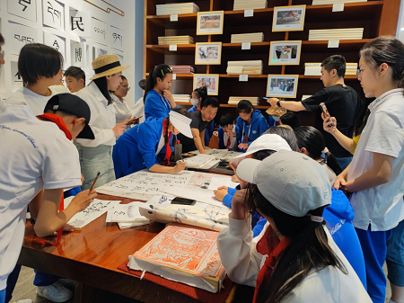 图为学生们在云南典籍博物馆参与书法创作活动