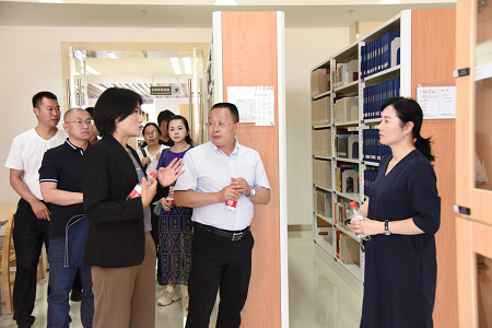 5月31日上午,调研组一行到楚雄州图书馆,实地查看各个服务窗口和业务部门,详细询问、了解近年来州图书馆工作情况,参观彝族文献图书馆,了解掌握州图书馆彝文古籍保护修复工作情况。在调研座谈会上,楚雄州图书馆馆长黎建宾介绍了近年来州图书馆在推动全州各级公共图书馆高质量发展、组织古籍保护工作等方面的情况。杨和祥馆长对州图书馆各项工作开展情况给予肯定,认为州图书馆的工作特色和亮点突出,特别是彝族文献图书馆建设及彝文古籍保护成绩显著。针对州图书馆面临的经费缺乏、馆舍面积不足、人员紧缺等实际问题,也提出了工作建议。楚雄州文化和旅游局党组书记石文武、副局长罗彦一起参加调研。
