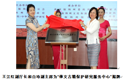 2023年7月10日上午,“傣文古籍保护研究服务中心”揭牌仪式和“国家级藏文古籍修复基地和技艺传习中心(云南)”授牌仪式在西双版纳州顺利举行。国家图书馆、国家民委全国少数民族古籍整理研究室、复旦大学、云南省文化和旅游厅、西双版纳州等相关单位领导和专家,以及来自泰国清迈皇家大学的学者出席仪式。
