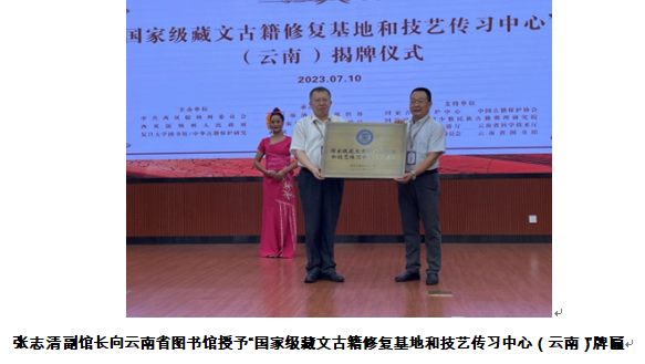仪式上,云南省文化和旅游厅党组成员、副厅长王江红和西双版纳州政协副主席白玲为西双版纳州图书馆“傣文古籍保护研究服务中心”揭牌;国家图书馆常务副馆长、国家古籍保护中心副主任张志清向云南省图书馆授牌“国家级藏文古籍修复基地和技艺传习中心(云南)”,云南省图书馆馆长杨和祥代表本馆接受牌匾。