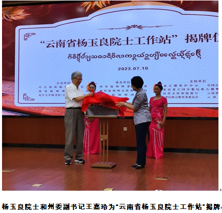 当天上午,还举行了由西双版纳傣族自治州委、州政府和复旦大学图书馆共同主办的“云南省杨玉良院士工作站”揭牌仪式,杨玉良院士是中国科学院院士、复旦大学教授,现任复旦大学中华古籍保护研究院院长。杨玉良院士工作站落地西双版纳,标志着云南省文化旅游系统首个院士工作站正式建立。该工作站为深入开展傣文古籍保护工作、培养古籍保护高级人才创造了前所未有的发展机遇。