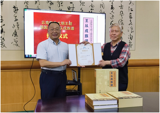 随后,王国亮老主任向云南省图书馆捐赠了《云南陆良大明王朝镇国将军王从戍族谱》三套,杨和祥馆长代表本馆接受捐赠并颁发了收藏证书。