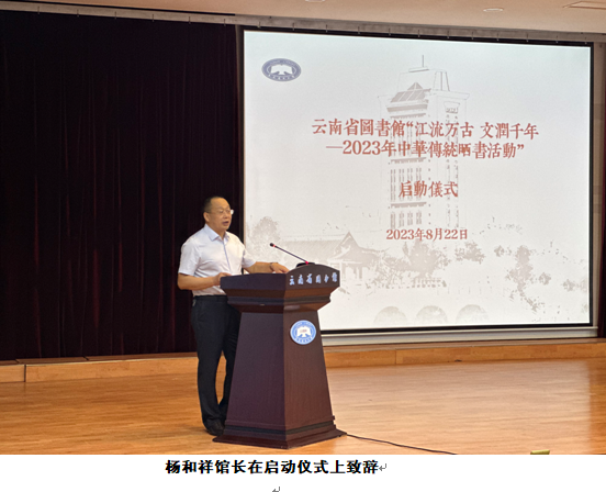 8月22日上午,云南省图书馆“江流万古 文润千年——2023年中华传统晒书活动”正式启动。省图书馆领导和干部职工、读者朋友、新闻媒体记者参加启动仪式。省图书馆副馆长周宇青主持仪式,省图书馆馆长、云南古籍保护中心主任杨和祥致辞并宣布活动正式启动。杨和祥馆长在致辞中介绍了云南省图书馆近年来探索新时代古籍保护工作的新思路和新方法,表示此次开展中华传统晒书活动,不仅要晒古籍、晒经典,还要晒技艺、晒成果,进一步做好中华优秀传统文化宣传推广工作,营造全社会共同参与保护传承中华优秀传统文化的浓厚氛围。