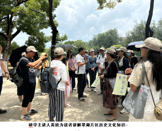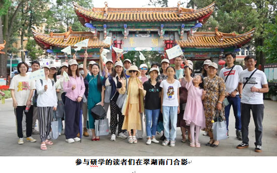 下午,本次晒书系列活动的重头戏“六百年翠湖与百年云图——流动的云南生活”主题研学活动如期举行,通过云南省图书馆微信公众号报名成功的25位读者参加活动。研学队伍从翠湖北门(经正书院旧址)出发,依次步行经过昆明自来水博物馆、唐堤、莲华禅院旧址、水月轩和阮堤,最后在翠湖南门结束行程。途中,研学主讲人黄欣老师为大家讲述了翠湖片区历史状况、水域改造与古代昆明城址的变迁等知识。省图书馆高鹏宇馆员通过回溯云南省图书馆馆址沿革,向大家介绍了百年云图的发展历程。回到图书馆后,大家参观了云南典籍博物馆和“藏典云滇——云南珍贵古籍展”。讲解员认真细致地为大家讲解了古籍的基本知识,从形态各异的文献载体、丰富多彩的版本类型、典雅精致的装帧形式,到栩栩如生的雕版印刷,每位读者都充分感受到中华优秀传统文化的魅力。第一次近距离接触古籍,大家饶有兴趣地欣赏着展柜内的珍本,无不沉浸在这场“让古籍活起来”的文化盛宴中。