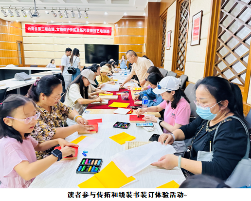 当天还开展了传拓及线装书装订体验活动,数十位体验者满怀着对传统文化的热爱参与到体验活动中。活动现场,由昆明市非物质文化遗产代表性传承人张衡为大家讲授传拓基础知识和常见传拓方法,并演示扑拓和蜡墨拓两种传统拓印技艺。随后在张老师的指导下,大家上手拓印,用一幅幅五颜六色的DIY作品展示着文化传承的力量与自信。同时,云南省图书馆古籍修复师也在一旁耐心指导读者进行古籍线装书装订体验,那一针一线的穿引,仿佛在穿越古今。大家无不兴致盎然,乐在其中。活动结束后,大家意犹未尽地带着各自的作品满载而归。