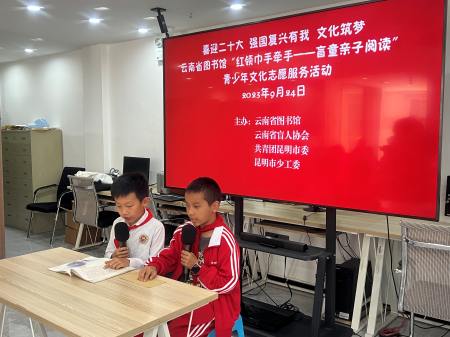 2023年9月24日,云南省图书馆在视障阅览室举行了主题为“强国复兴有我,文化筑梦”的“红领巾手牵手——盲童亲子阅读”青少年文化志愿服务活动。