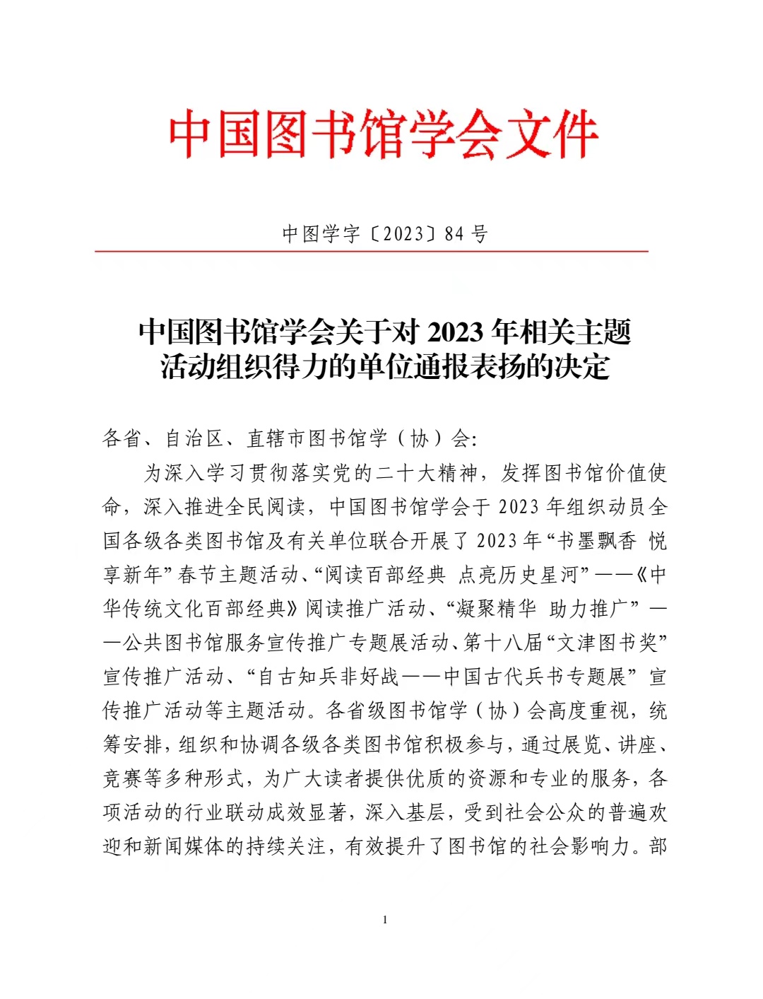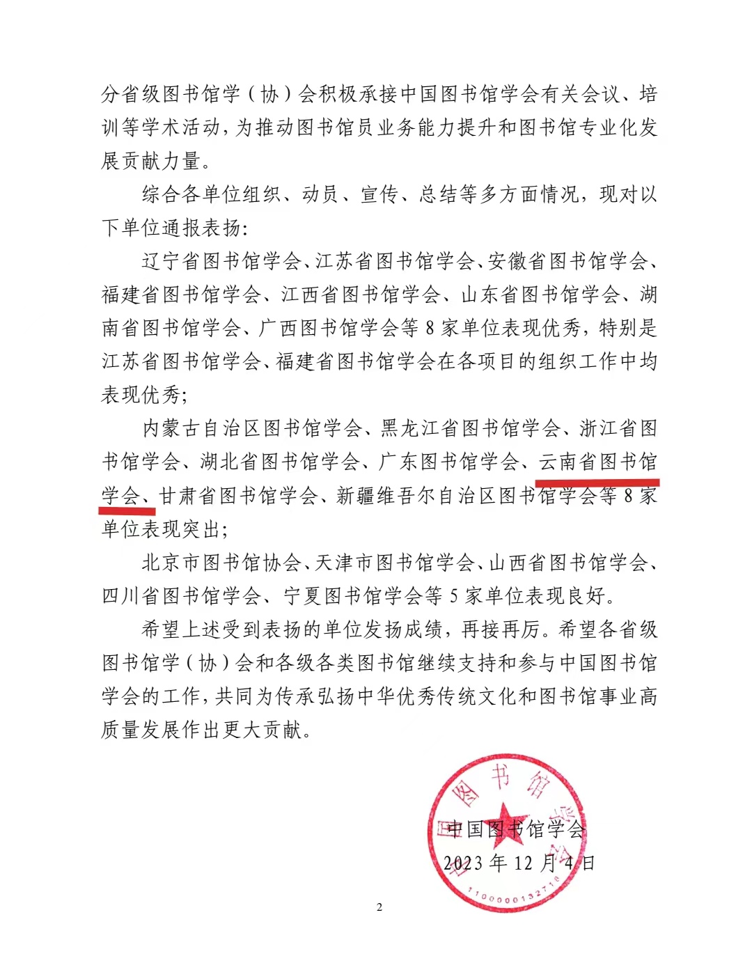近日,中国图书馆学会对在2023年相关主题活动中表现突出的单位进行了通报表扬。云南省图书馆学会凭借卓越的组织能力和突出贡献,连续第二年获得“表现突出”荣誉。