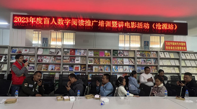 为进一步丰富广大盲人读者的精神文化生活,大力开展视障阅读推广培训活动,2023年12月9日,由云南省图书馆主办、沧源县图书馆承办、各相关单位协办的“云南省图书馆盲人数字阅读推广培训暨文化助盲影片放映”活动在临沧市沧源县图书馆举行。视障读者与家属代表、文化志愿者共40余人参加了此次活动。
