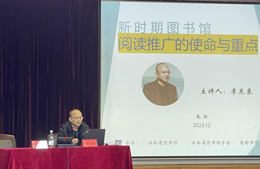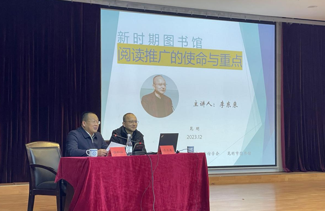 2023年12月22日下午,为推动新时代公共图书馆阅读推广和公共文化服务工作,进一步激发图书馆工作者对传承弘扬中国优良阅读传统与中华优秀传统文化的信心和担当,由云南省图书馆、云南省图书馆学会主办的阅读推广人培养与文化传承发展专题讲座在云南省图书馆成功举办。东莞图书馆原馆长、中国图书馆学会阅读推广委员会主任李东来作为主讲嘉宾,以《新时期图书馆阅读推广的使命与重点》为主题,为听众带来了一场精彩的讲座。云南省图书馆党委书记、馆长杨和祥主持讲座,云南省图书馆领导和干部职工、昆明市图书馆职工代表和部分读者等200余人听讲。