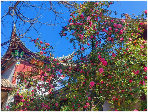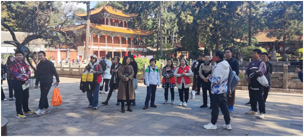 到达升庵祠后,文化学者黄欣老师带领大家参观了升庵祠,并介绍了杨升庵和徐霞客两位名人与云南的密切联系,以及徐霞客在云南游历的路线。随后,研学团队沿着徐霞客走过的路,向下一个目的地华亭寺出发。山路崎岖,坡高路陡,每个人在徒步的过程中都感受到了徐霞客当年靠双脚走完“万里遐征”的不易。在华亭寺,黄欣老师为大家介绍了华亭寺的历史沿革和建筑布局。寺庙内一株盛开的山茶花使人想到380多年前徐霞客来到西山看到山茶花兴而记录的场景,今人与古人对于美的感受是同步的。参观完华亭寺后,研学团队沿着徐霞客曾经走过的“太华古道”,继续登山,向下一个目的地太华寺出发。沿途,读者朋友们领略了西山开阔的风景,身心俱愉。太华寺的建筑格局与华亭寺迥然不同,是回廊式的庙宇,在黄欣老师的讲解下,大家了解到太华寺的历史变迁。