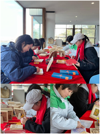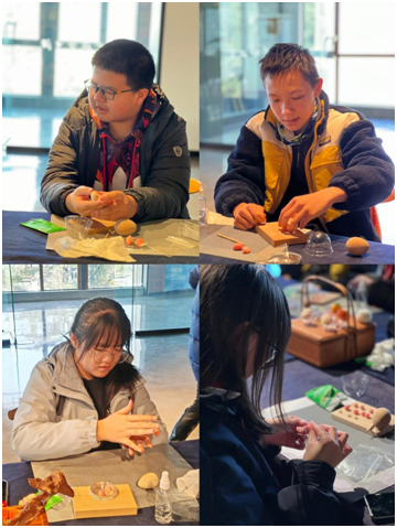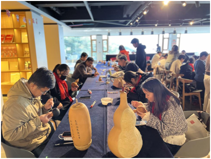 下午,研学团队在艾维美术馆开展活动,首先参观西南联大文史专题书画展,感受家国情怀。该展览主要展出劳伟先生手书刘文典诗词作品,由中国著名书画艺术家劳伟先生之子、艾维美术馆负责人、艾维文旅产业集团副总经理劳峻进行讲解,带领大家领略西南联大时期刘文典先生“独抱坚贞”的品格。参观结束后,研学团队来到美学空间,进行非遗手工艺现场制作体验,了解传拓技艺、葫芦雕刻以及唐菓子制作等非物质文化遗产。活动中,云南省图书馆历史文献部副主任、古籍修复师杨敏仙,昆明市非物质文化遗产项目葫芦雕刻代表性传承人徐孝国、唐菓子制作技艺区级非遗代表性传承人阮智敏分别介绍了三种传统技艺的传承历史及制作方法。而后,读者们开始体验非遗制作,有的读者在徐老师的指导下在葫芦上作画,十分细致认真;有的读者跟随阮老师制作唐菓子,软软的白芸豆泥在手中叠捏成花;还有的读者在杨敏仙老师的带领下,用自己传拓的作品装饰扇子,每人都可以带走一把自己亲手制作的传拓扇子。大家参与活动的热情高涨,每个人都积极动手参与其中,感受非遗的魅力,圆满结束了一天的研学活动。