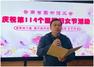 活动在田景能副馆长的致辞中拉开序幕。田副馆长表示,云南省图书馆女职工人数占全馆总人数的60%,许多重要职务和岗位都由女性担任。女职工们自信、自立、自强,在各自岗位上爱岗敬业、担当奉献、绽放芳华,已然成为推动云南省图书馆事业高质量发展的中坚力量。在表达了对全馆女职工的节日祝贺和致敬后,田副馆长希望大家能度过一个愉快美好的节日。