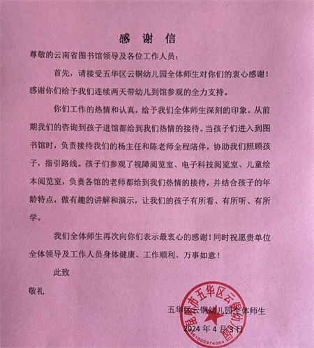 值得一提的是,活动结束后,云铜幼儿园还专门给云南省图书馆发来感谢函,衷心感谢本馆的热情、专业接待。