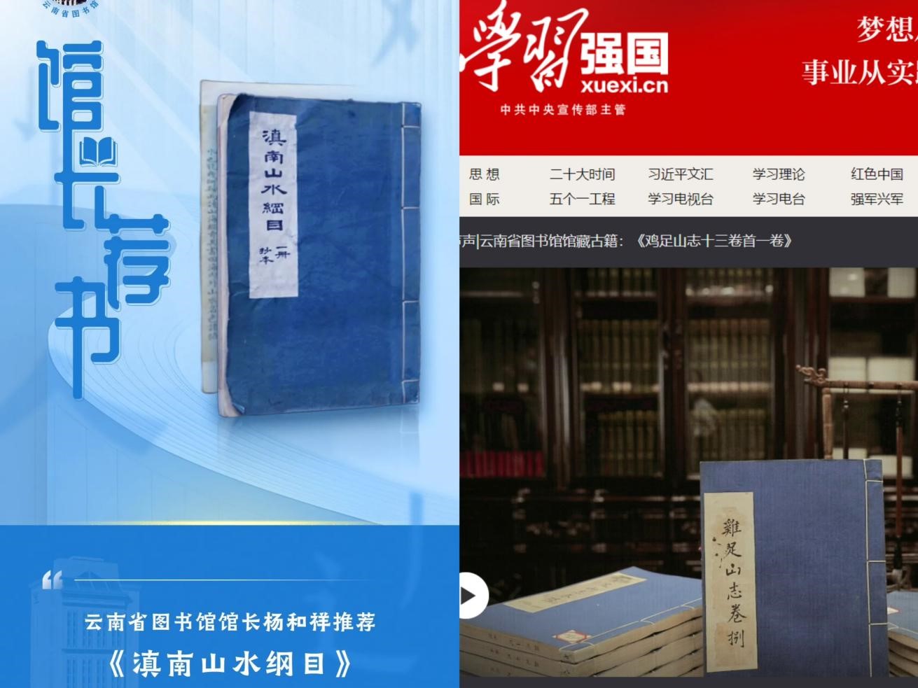 云南省图书馆与学习强国云南学习平台联合推出“馆长荐书”“古籍声声”系列策划。由云南省图书馆党委书记、馆长杨和祥带大家品读云南地方文献中的“传世佳作”——《滇南山水纲目》;用视频方式详细介绍《鸡足山志》《六河图说》《滇诗丛录》等20部云南省图书馆馆藏精品古籍。让公众通过镜头了解云南历史、读懂云南文化、讲好云南故事。这不仅是一次云南珍贵古籍的视觉盛宴,也是一次深刻的文化之旅。