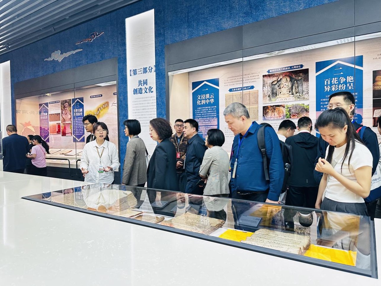 2024年4月22日,“用珍贵古籍讲好云南‘铸牢中华民族共同体意识’的生动故事”专题展览在云南省图书馆“云南典籍博物馆”正式开展。展览精心遴选展出72部(件)古籍,其中31部入选《国家珍贵古籍名录》、民族文字古籍和绘画42部(件),包括藏文、彝文、傣文、傈僳文、东巴文、方块瑶文、水文、方块白文8种少数民族文字古籍。可谓百花争艳,异彩纷呈。开展当天,文化和旅游部、国家图书馆、各省(区、市)文化和旅游厅(局)公共服务处、各省级公共图书馆,以及我省各州、市文化和旅游局、州市图书馆相关负责同志共200余人参观了展览。