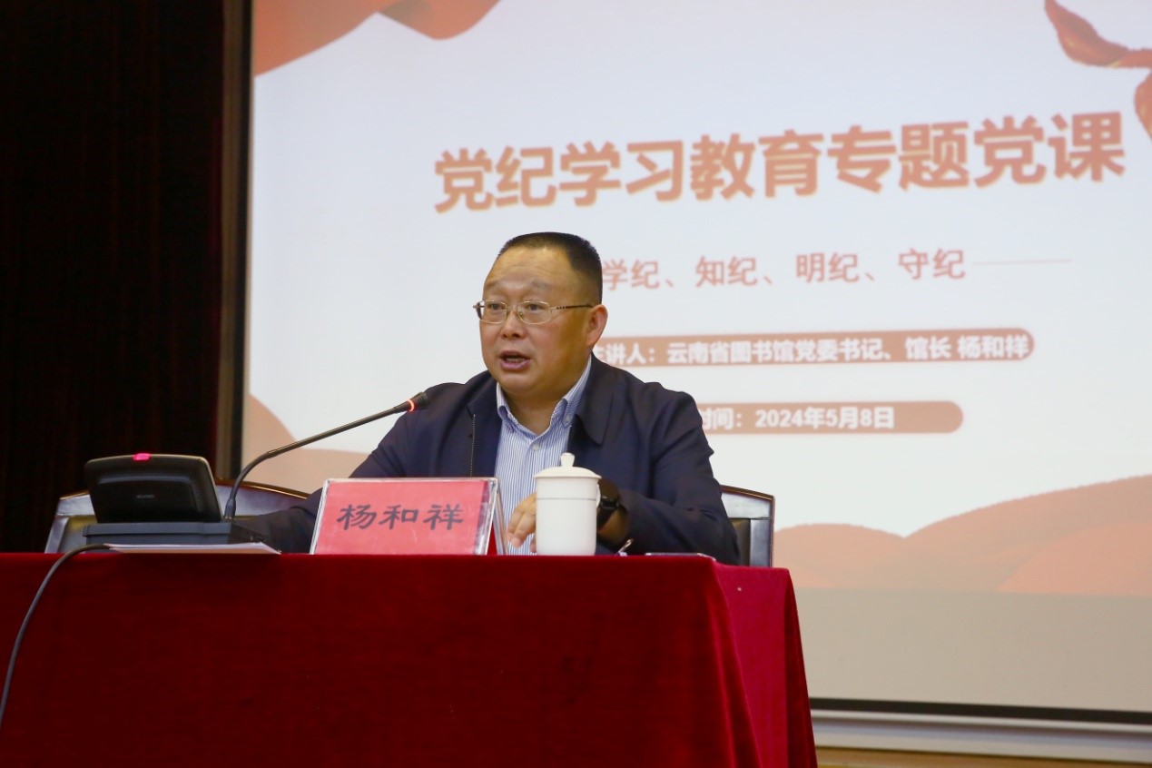 为深入开展党纪学习教育,号召全馆党员和干部职工筑牢纪律之基,自觉把铁的纪律转化为日常习惯和行动准绳,切实推动云南省图书馆党纪学习教育见行见效,2024年5月8日,馆党委举行党纪学习教育专题党课,由云南省图书馆党委书记、馆长杨和祥围绕党纪学习教育总体要求,以“学纪、知纪、明纪、守纪”为主题,结合图书馆重点工作进行了现场专题授课。云南省图书馆党委副书记、副馆长鲁颖主持党课,馆领导班子、全体党员、全体中层干部参加听讲。