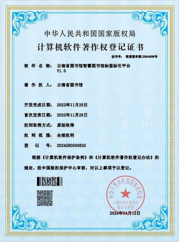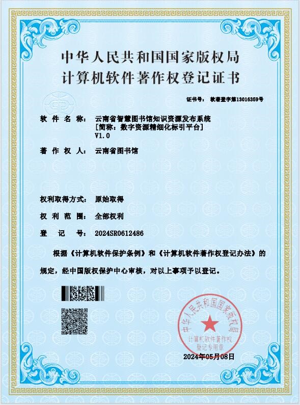 云南省图书馆知识图谱管理等4个平台获国家版权局计算机软件著作权登记证书