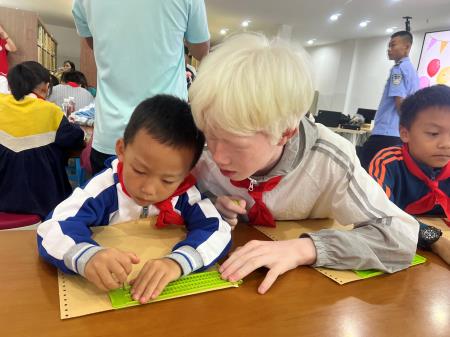 在视障儿童担任“小老师”活动环节,孩子们展示了出色的盲文书写能力。他们熟练地拿起特制“笔”,在写字板上流畅地书写着盲文。旁边观看的健全儿童们好奇而敬佩地看着这一切,他们或许从未如此近距离地接触过盲文,也从未想过视障的小伙伴们能够如此自如地书写。随后,视障小老师们开始耐心地向结对的小伙伴讲解盲文的书写规则和辨识方法,孩子们虚心学习,认真模仿,展现出了对知识的渴望和对同伴的尊重。