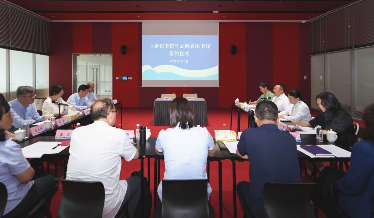 为深入学习贯彻习近平文化思想,贯彻落实新时代推动西部大开发座谈会精神,深化“沪滇合作”,加强云南省图书馆与上海图书馆的协作交流,助推“书香中国”建设,2024年7月4日至6日,由云南省图书馆党委书记、馆长杨和祥带队,副馆长周宇青及数字资源与信息技术部、培训研究部主要负责人组成的工作组,前往上海图书馆调研座谈并正式签订“上海图书馆(上海科学技术情报研究所、上海市古籍保护中心)与云南省图书馆(云南省古籍保护中心)协作交流框架协议”。