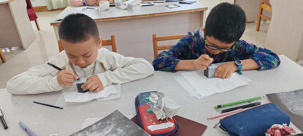 此次培训特别邀请著名书法家、篆刻家张国武老师授课。张老师利用丰富的教学理论、实践经验,通过理论讲解、实践操作和现场指导等多种形式,为小朋友们详细讲解了篆刻的历史渊源、工具使用、技法要领等知识,并指导孩子们亲手拿起刻刀,在方寸之间展现自己的创意和才华。