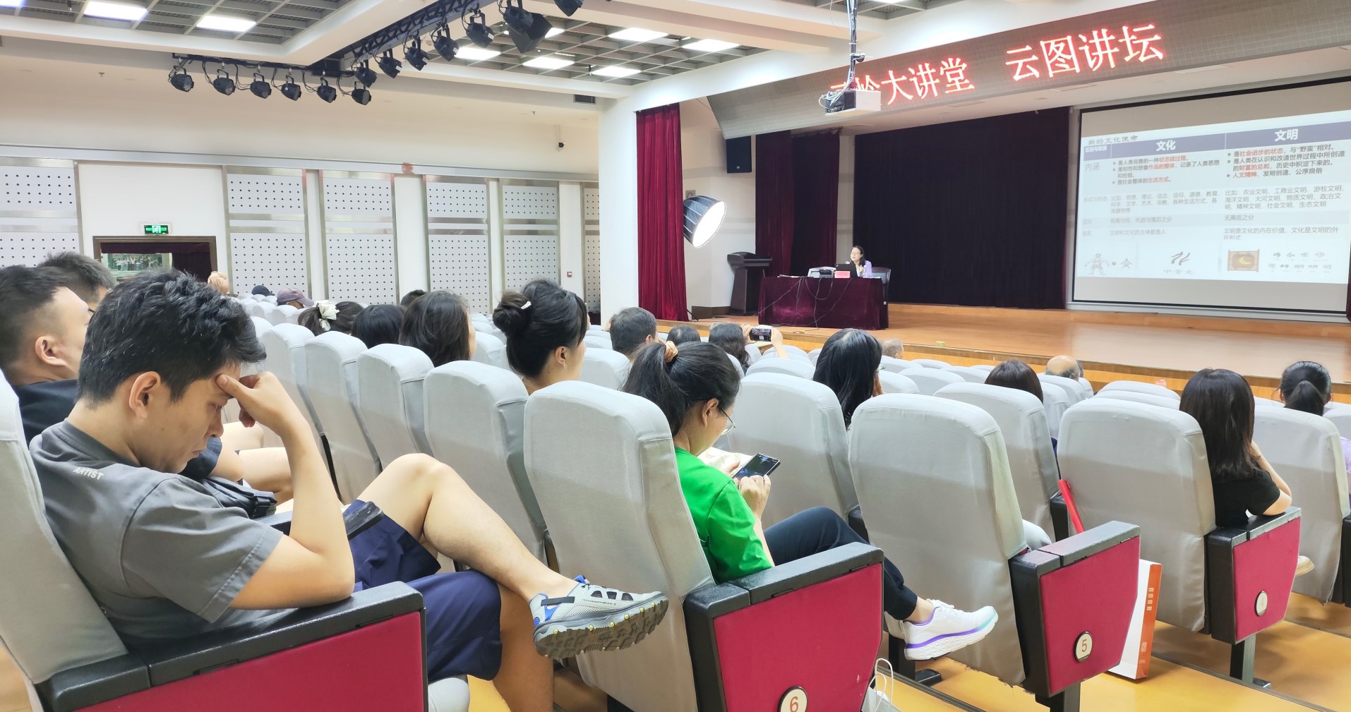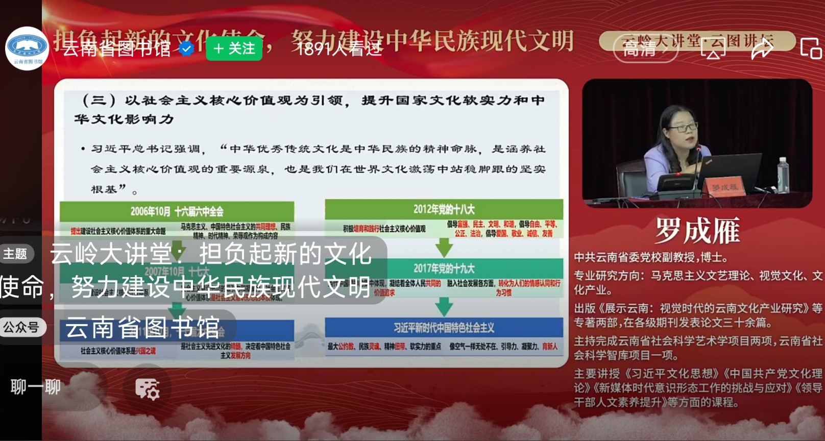 图书馆作为文化与智慧的灯塔,不仅承载着传承与守护中华优秀传统文化的神圣职责,更肩负着在新时代弘扬中华文脉、推动社会主义文化繁荣兴盛的重大使命。2024年8月25日,“云岭大讲堂·云图讲坛”邀请中共云南省委党校副教授罗成雁来到云南省图书馆,以“担负起新的文化使命,努力建设中华民族现代文明”为题,为现场及线上观众奉献了一场思想深刻、启迪心灵的公益讲座。讲座通过云南省图书馆微信视频号进行线上直播,吸引了线上线下2000多名听众的热情参与。