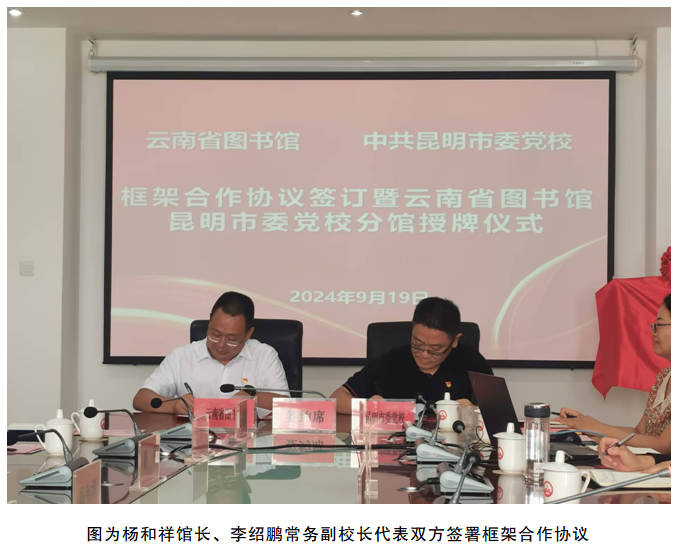 随后,杨和祥馆长、李绍鹏常务副校长代表双方签署了框架合作协议,并在参会人员的共同见证下,为“云南省图书馆昆明市委党校分馆”授牌。