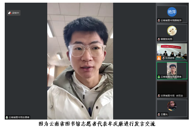 云南省图书馆作为受邀单位之一,由志愿者代表牟庆康进行了发言。牟庆康分享了自己参加2024年“中华古籍保护文化志愿服务行动·云南行”的古籍普查实践经历以及收获,讲述了云南省图书馆在古籍保护志愿服务方面的经验做法、亮点成果。