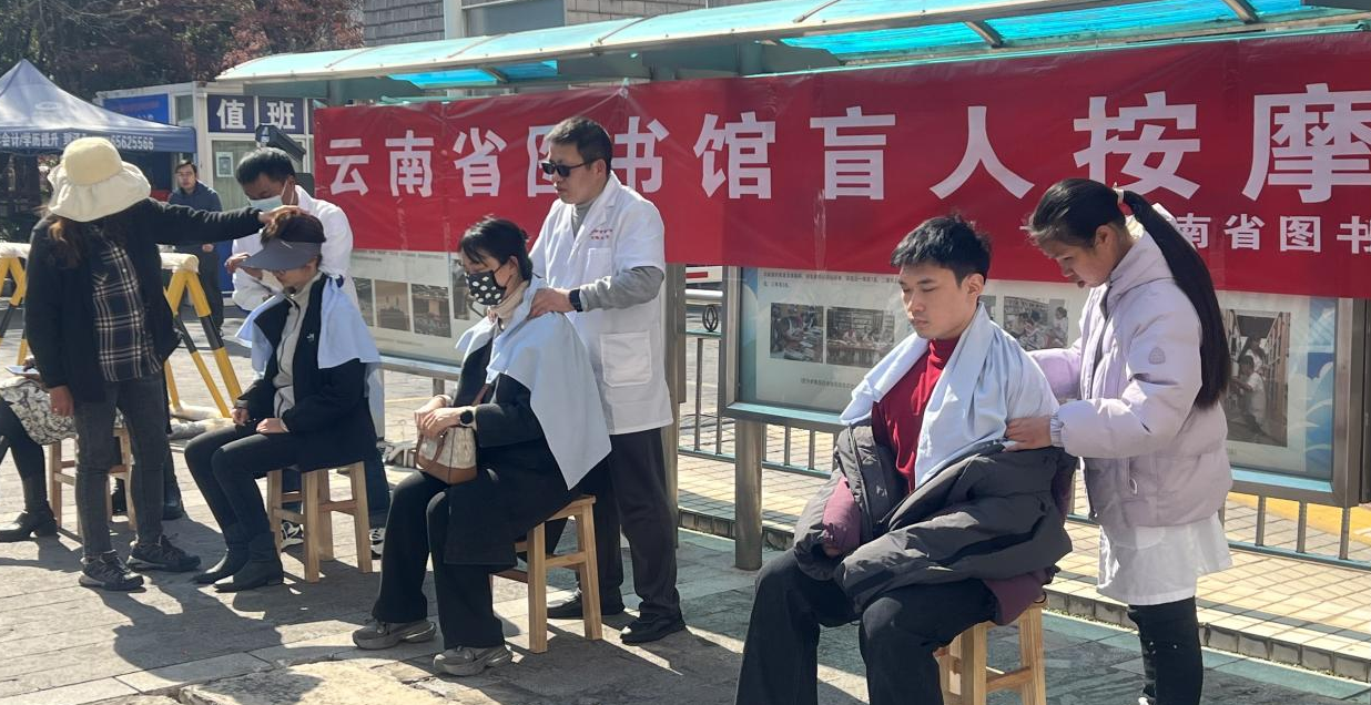 2025年1月17日上午,一场旨在回馈社会的爱心公益活动在云南省图书馆前院广场举行,省图书馆视障阅览室暨盲人技能培训基地几位身着洁白工作服的视力残疾按摩技师,在深冬的暖阳下,连续五个小时免费为90余位读者朋友提供了精湛专业的按摩服务。每一位体验者脸上洋溢着的笑意以及他们发自内心的真诚感谢,不仅彰显了对我馆技师精湛专业手法的深度认可,更是对本馆精心策划举办这项活动的最高赞誉。