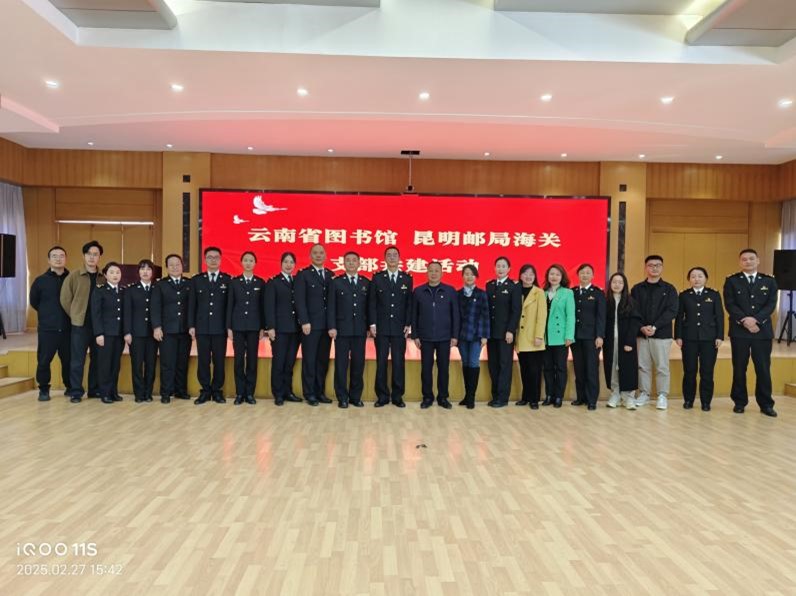 2025年2月27日,在昆明邮局海关一楼大厅,举办了云南省图书馆昆明邮局海关分馆揭牌仪式,昆明邮局海关关长杨旻睿、副关长朱峰、工会主席杨艳,云南省图书馆党委书记、馆长杨和祥,党委副书记、副馆长鲁颖出席活动。昆明海关各党支部代表和云南省图书馆第四党支部代表、青年理论学习小组代表参加活动。
