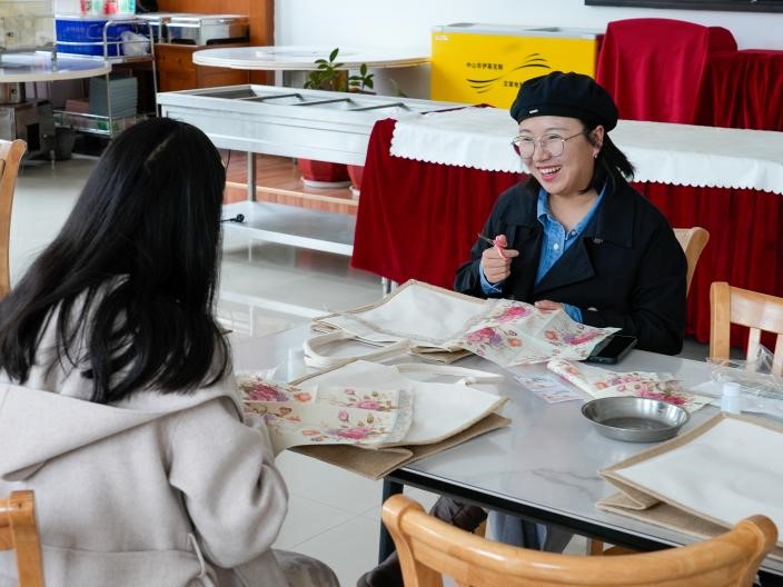 手包制作活动现场更是奇思妙想频频闪现,工具包里面的示意图没有禁锢住女职工们的创造力。看,女职工们有的互相交换图案元素,让向日葵和蝴蝶同飞共舞;有的自由创作摆放图案,让平平无奇的手包焕发出民族文化的意蕴;有的则是花团锦簇共举齐放,让朵朵纸花绽放出国泰民安的光彩。可以说,女职工制作的手包花样百出,各不相同,最后再将丝巾蝴蝶结一系,一个上班通勤的好搭子就成功制作完成。春天的印迹再一次留下来成为永恒。