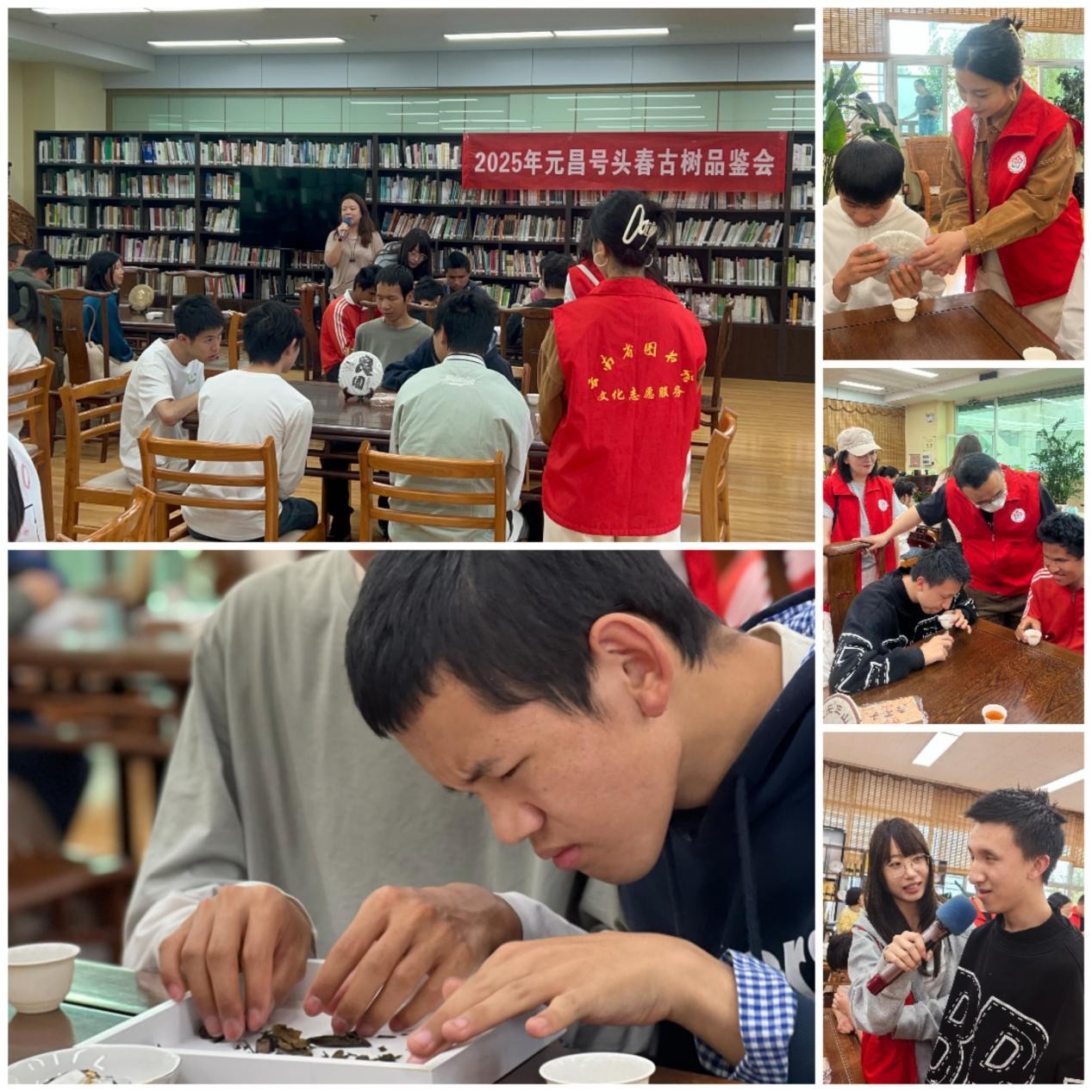 在普洱茶图书馆,志愿者团队为同学们组织了一场别开生面的茶话会,伴随着老师的普洱茶知识文化讲解,大家先后品鉴了绿茶、红茶、生茶和熟茶,通过触其形、闻其味、品其汤对普洱茶有了立体的了解。美食是人类的通用语言,普洱茶香也快速激活释放了同学们的青春本色,茶话会氛围热烈活泼,同学们积极发言互动,欢声笑语此起彼伏:“这个(摸起来)像大叶子” “这个茶跟我爸爸喝的味道不一样,这个比较清淡” “哎呀!我才吃了棒棒糖喝起来都是奶茶味” “我说我说!(绿茶)烤鸡翅膀味、(红茶)奶茶味、(生茶)水果味、(熟茶)中药味” “再来一杯!谢谢!”“我还想要一杯”“你都喝了四五杯了”……