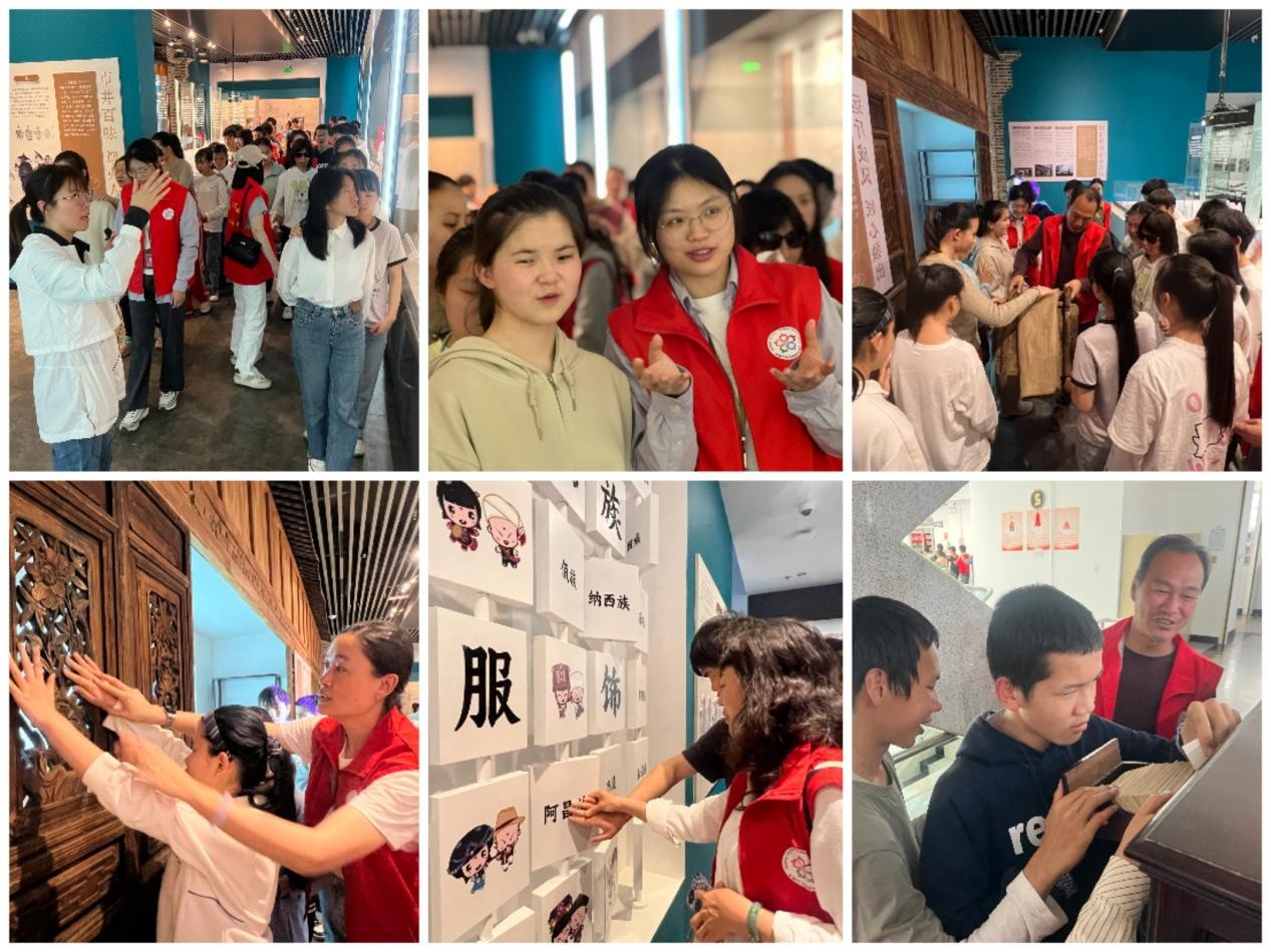 在典籍博物馆,志愿者为大家作“典籍里的云南”文献展解说,并针对视障同学调整了讲解内容和方法,在聆听讲解的同时同学们也实地触读了博物馆里的云南特色文化。