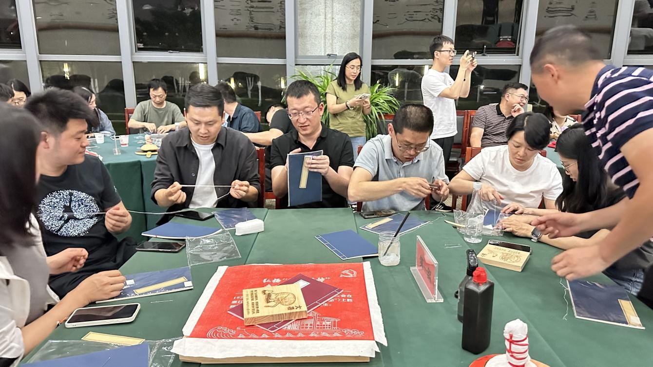 在实践体验环节,学员们分组体验拓印和古籍修复活动,大家手持工具,在按压上色和穿针引线间体会匠人精神。 “红船精神”“延安精神”“江山就是人民 人民就是江山”等主题拓片成为众人关注焦点。学员们蘸墨、铺纸、轻拓,随着字迹与图案逐渐清晰,革命先辈的精神仿佛穿越时空,在指间的温度中触手可及。分享交流环节,多位学员结合活动感悟与工作实际发言,“传统文化技艺需要‘稳’与‘细’,基层工作亦需如此——既要沉下心打磨本领,又要精准对接群众需求”“主题拓片不仅是艺术作品,更是一面镜子,映照出我们党与人民血脉相连的初心”......