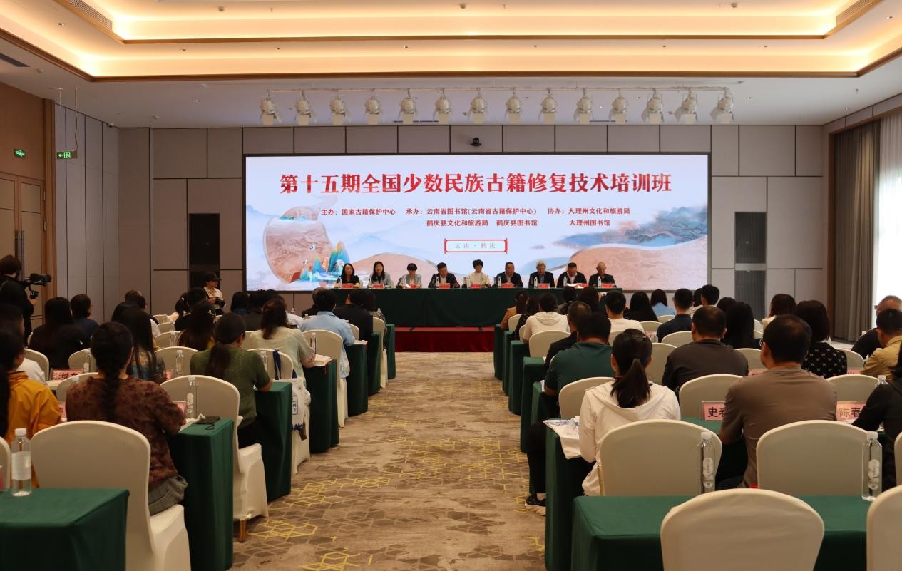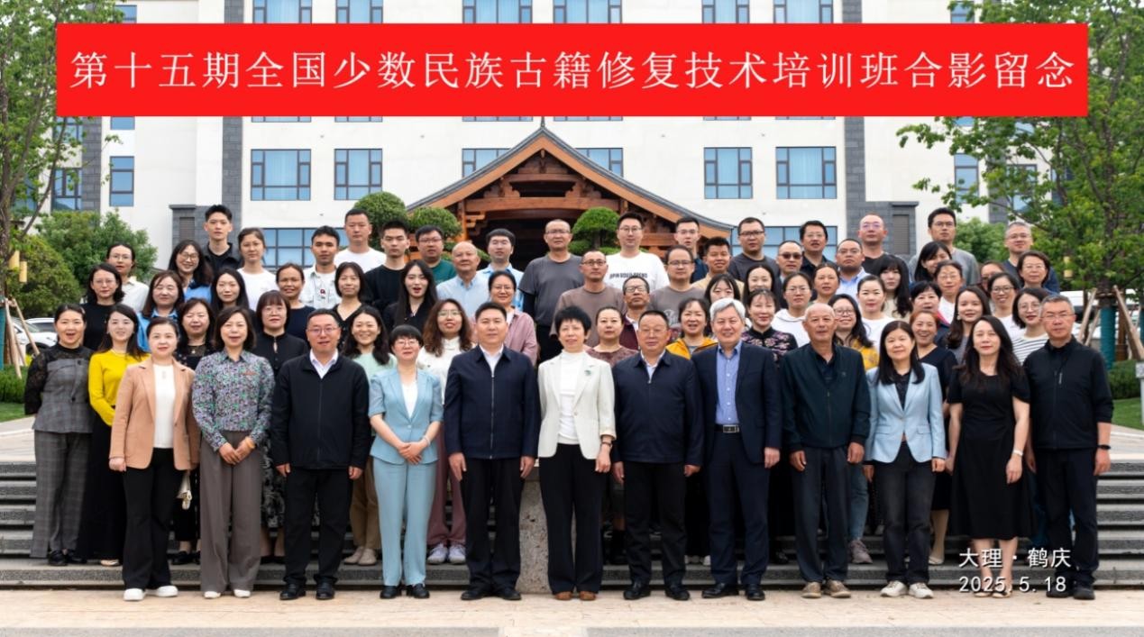 2025年5月17日至30日,由国家古籍保护中心举办,云南省图书馆(云南省古籍保护中心)、鹤庆县图书馆承办的“第十五期全国民族文字古籍修复技术培训班”在大理州鹤庆县举办,来自全国11个省份8个民族的53名学员圆满完成为期14天的学习。国家古籍保护中心办公室副主任萨仁高娃,国家古籍保护中心研究馆员庄秀芬,中山大学图书馆常务副馆长、研究馆员、古籍修复技艺传习导师林明,云南省图书馆党委书记、馆长、省古籍保护中心主任杨和祥,大理州文化和旅游局党组书记、局长杨学泉,鹤庆县委常委、县委宣传部部长李兆敏,县政府副县长郑巍黎及相关人员出席开班仪式。