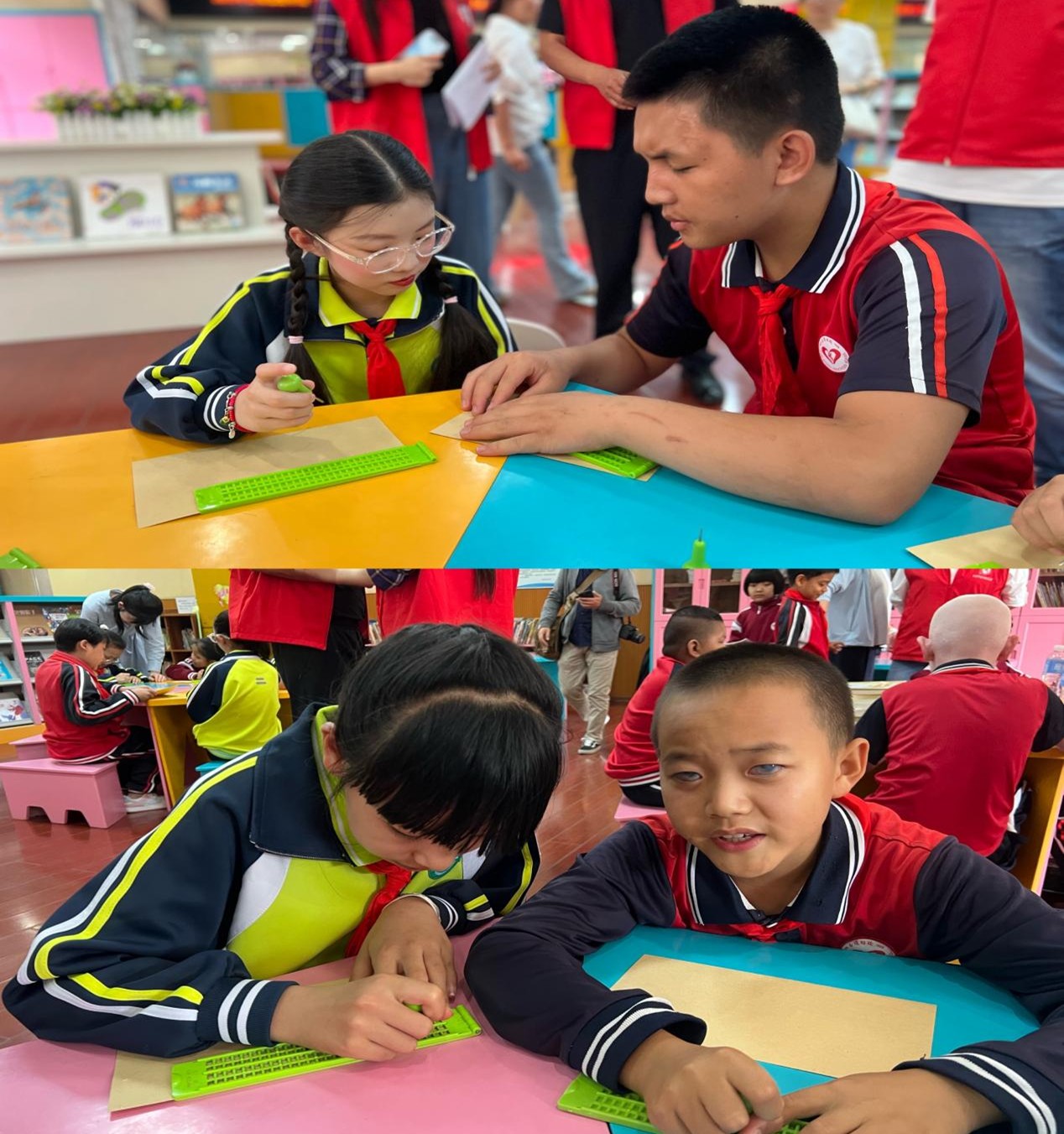 中国盲协副主席、云南省残联副主席、云南省盲协主席汪靖人首先致辞,鼓励孩子们积极乐观地迎接挑战,活出精彩的人生。随后,来自云南省图书馆的文化助盲志愿者岳子琦带领同学们开展“结对破冰”游戏,在她的带领下,孩子们之间的拘谨被打破,相互熟悉成为孩子们友谊的开始。在“盲文小课堂”环节,盲童的角色转换为“小老师”,他们耐心、细心地从“0”开始,教健全小伙伴们书写盲文。“老师”认真教,“学生”用心学,“老师”还对教学效果进行了“抽查考试”。最后,每个“老师”用盲文写了一句话送给自己的“学生”,作为这次教学活动的纪念品。
